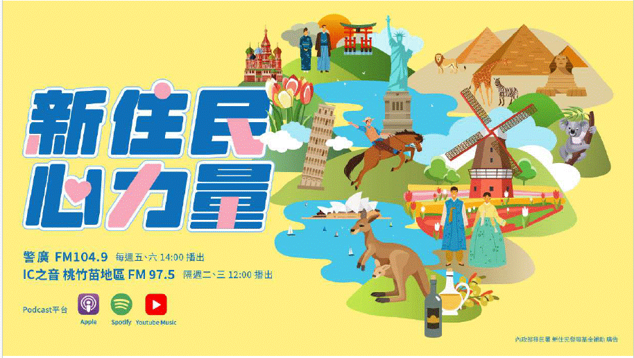 二、為保障新住民媒體近用權,內政部移民署委外製播新住民多元文化廣播節目,每週五、六下午2時於警察廣播電臺FM104.9頻道播出;另於地方電臺重播,時間為每週二、三中午12時於IC之音桃竹苗地區FM97.5頻道播出。錄製完成之節目也會置於各大Podcast平臺,供民眾收聽。