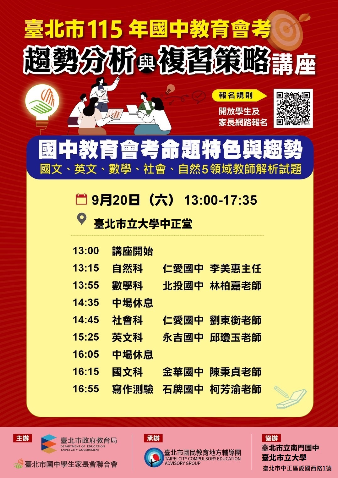 (五)報名方式:由臺北市國中學生家長聯合會負責,請於114 年9月18日前至下列連結網址填寫報名表:http://docs. google.com/forms/d/e /1FAIpQLSdlzTLeQhZA6xVFLfbYFQYn64gSJPJwv0ldCGlzPH UKITFhvg/viewform,若有報名相關問題,請逕洽貴校學 生家長會。