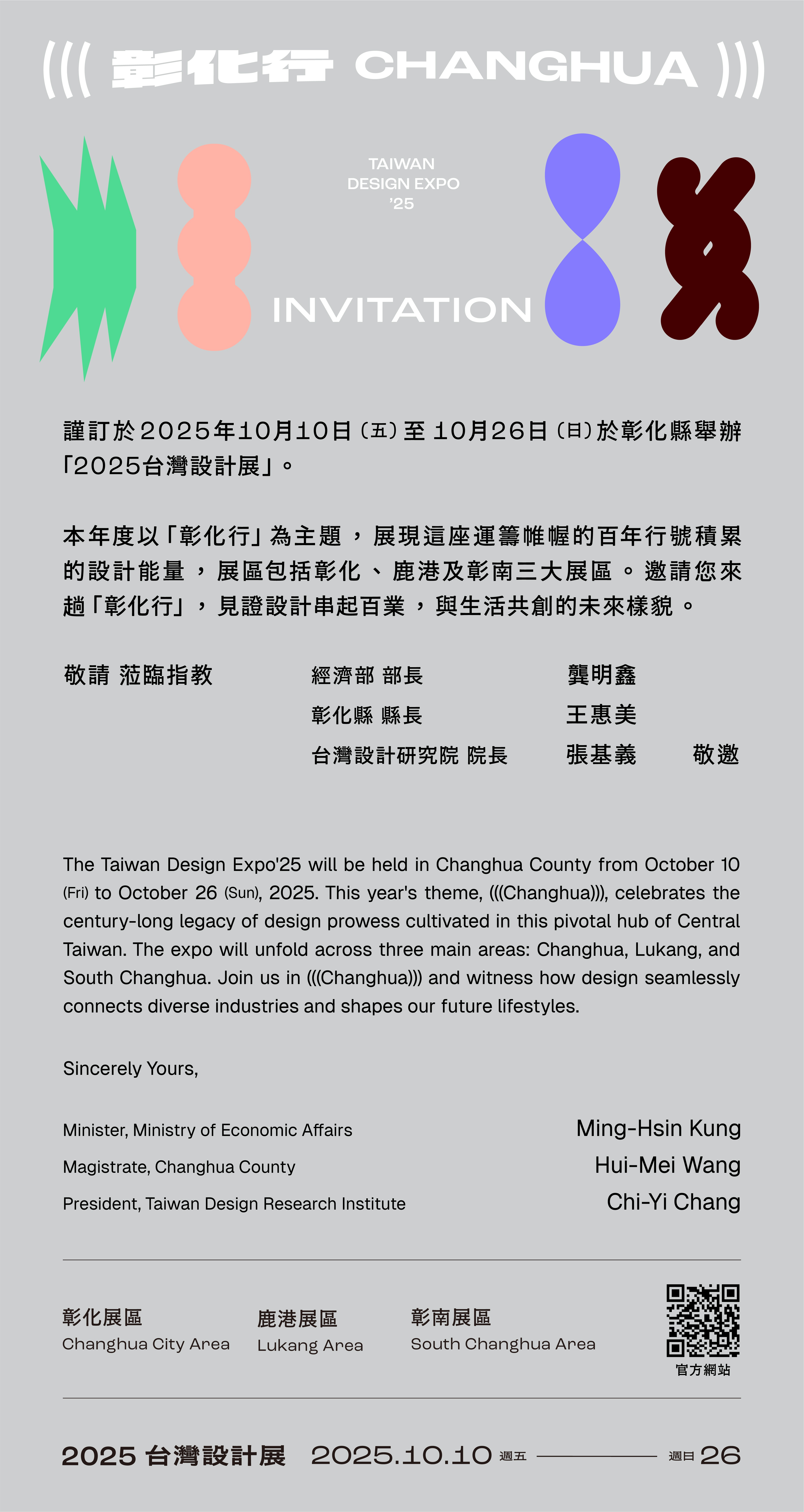 一、2025台灣設計展主題為「彰化行 (((CHANGHUA)))」,由設 計師聶永真操刀,匯聚700位設計師、1,640家廠商及600家 在地店家參與,展覽橫跨彰化、鹿港、田中、田尾等地, 規劃三大展區與15個主題展,完整呈現彰化的產業、文化 與創意。展區參觀時間為每日上午10點至下午6時,週五週 六延長至晚間8點。