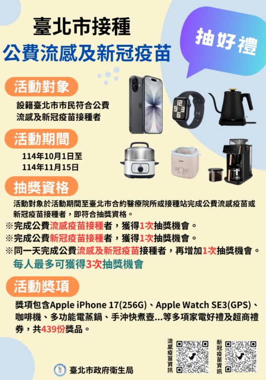 為提升本市民眾流感及新冠疫苗接種意願, 旨揭抽獎活動 期間延長至114年11月30日,並增辦第3次抽獎,活動內容 摘述如下: