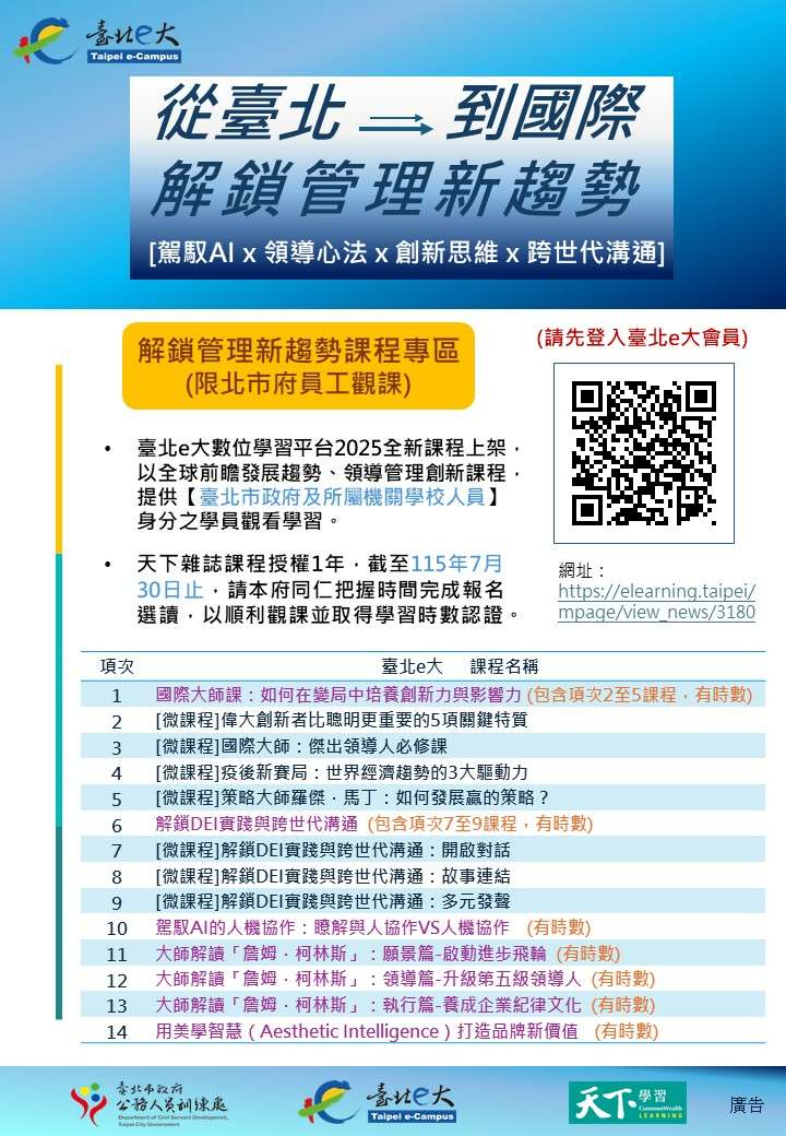 一、為持續引領本府同仁掌握國際趨勢及前瞻觀點新知,臺北e大數位學習平臺2025全新課程上架,以全球前瞻發展趨勢、領導管理創新課程,提供「臺北市政府及所屬機關學校人員」身分之學員觀看學習。