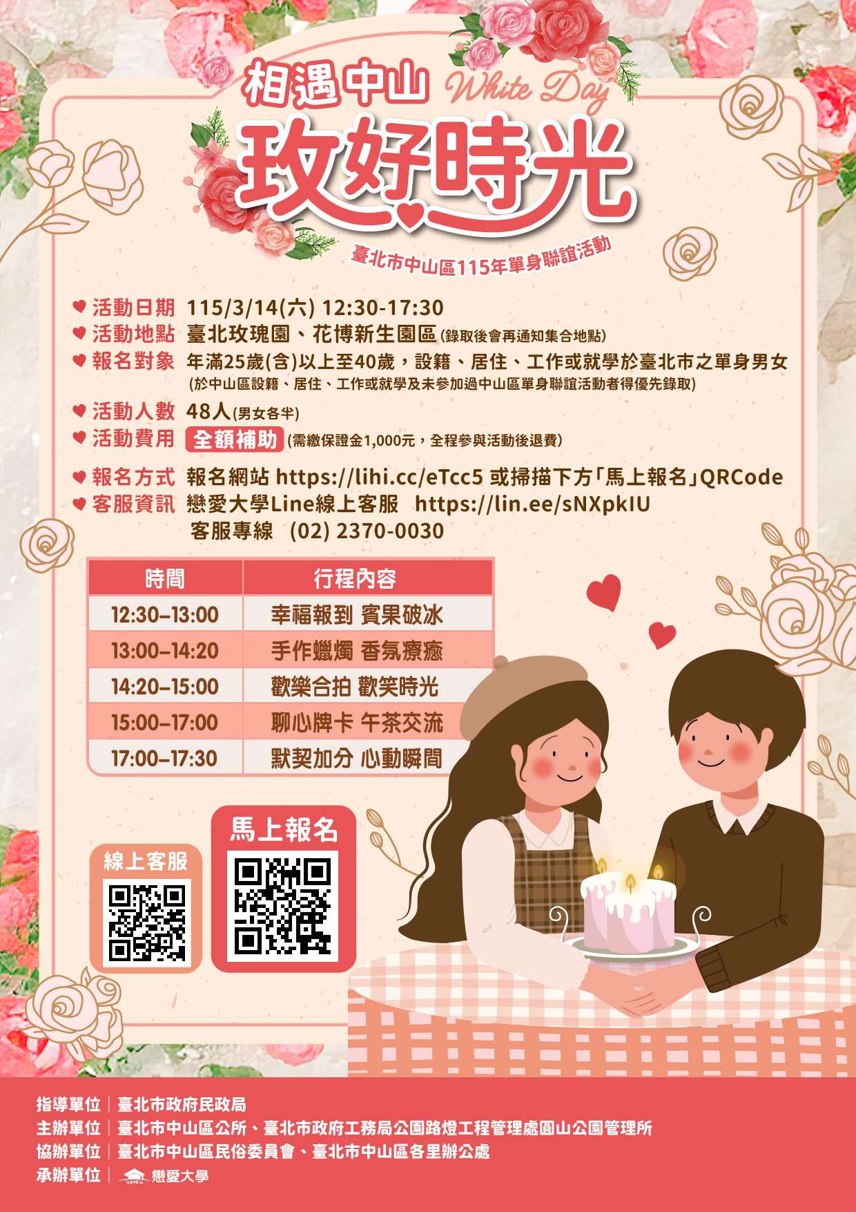 二、請貴單位惠予協助於所屬網站宣傳,文稿內容如下:「臺北市中山區公所『相遇中山 玫好時光』單身聯誼活動,將於115年3月14日(星期六)12時30分至17時30分假臺北玫瑰園及花博新生園區舉辦,活動名額為男、女各24人,共48人,歡迎年齡 25歲以上至40歲於本市設籍、居住、工作或就學之單身者踴躍報名參加(於中山區設籍、居住、工作或就學者及未參加過中山區單身聯誼活動者得優先),活動詳情請參閱本所官網(https://zsdo.gov. taipei/)或電洽(02)25031369分機593鍾小姐。」