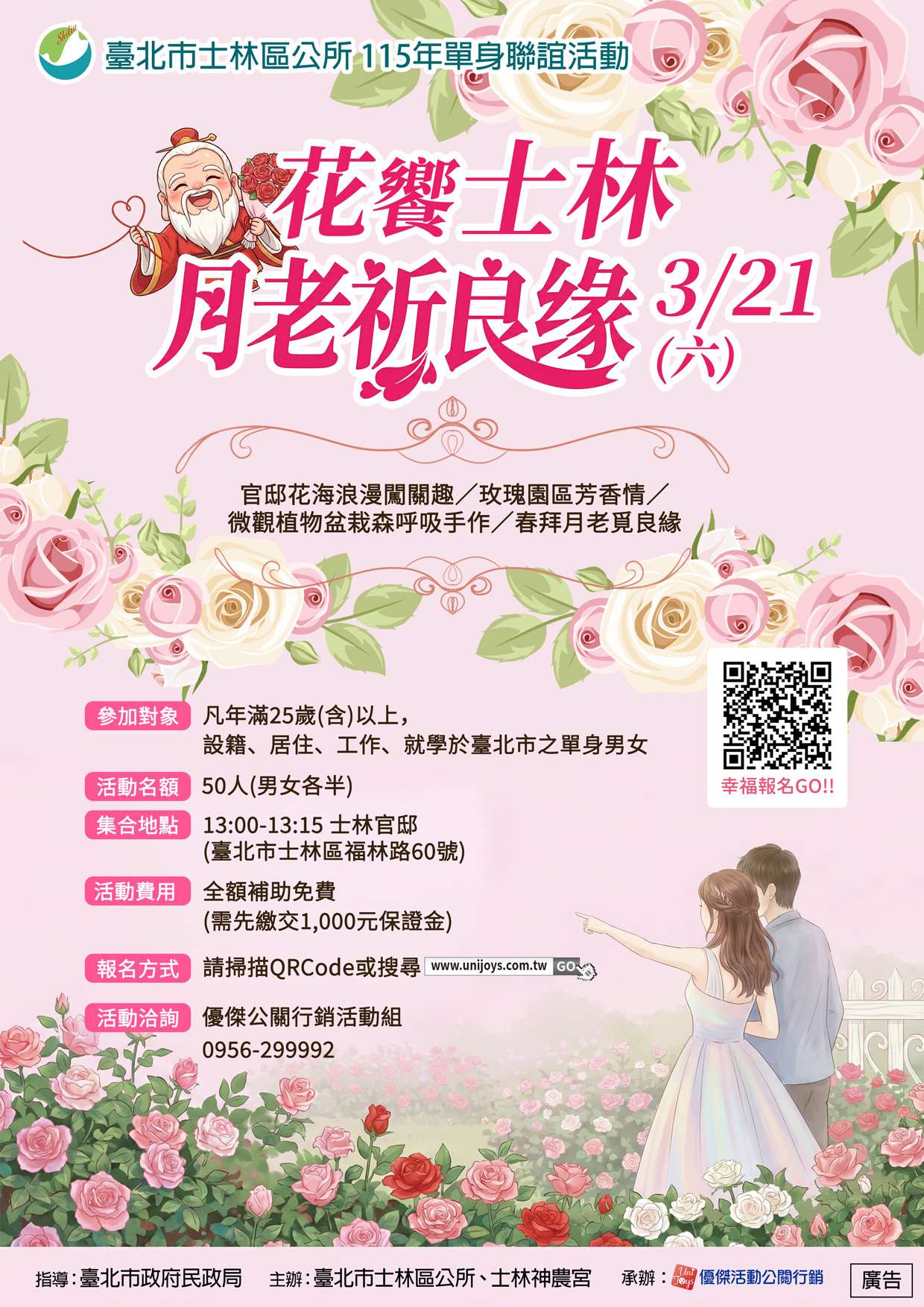 「臺北市士林區公所將於115年3月21日(星期六)辦理『花饗士林-月老祈良緣』單身聯誼活動,名額為男、女性各25人,歡迎年滿25歲(含)以上,設籍、居住、工作或就學於臺北市之單身者報名參加,活動詳情請參閱報名簡章。」