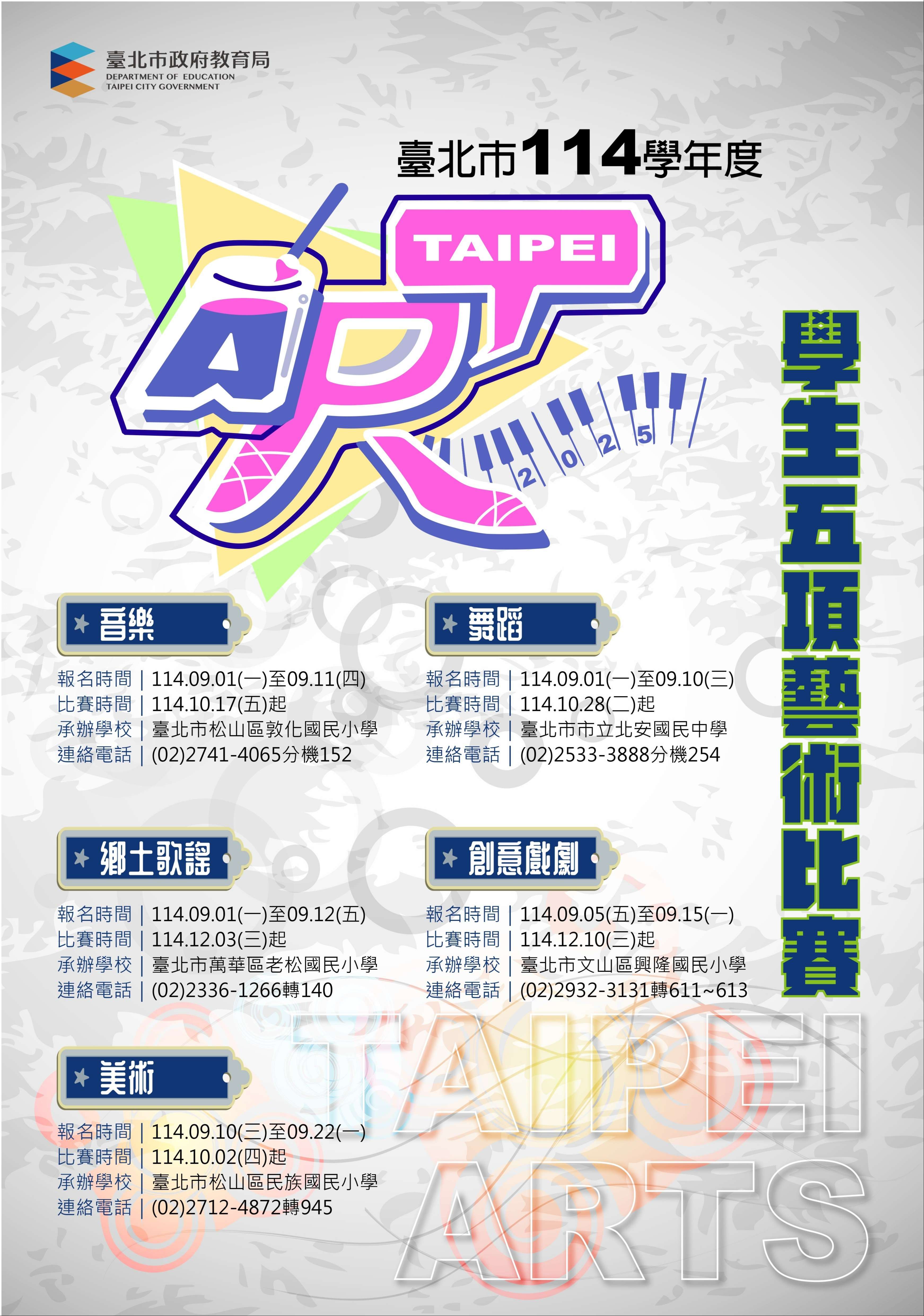 四、檢附本市114學年度學生五項藝術比賽時程表及海報,實施計畫電子檔可至本市五項藝術比賽網站(網址:https://www.tpcityart.tp.edu.tw /Home/ NewContent/484)下載。