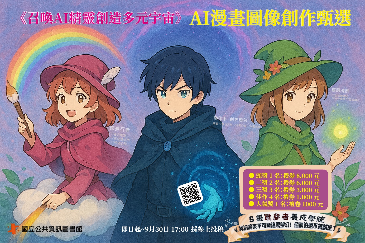 二、該館為鼓勵青少年活用AI技巧、發揮個人創意,以「我的未來職業想像」為主題,鼓勵14至22歲(民國92至100年出生)青少年以生成式AI出圖後進行後製編修。揭活動採網路投稿(活動網址:https://nlpi.pse.is/7nahqm),投稿時間自即日起至114年9月30日(星期二)下午5時止。