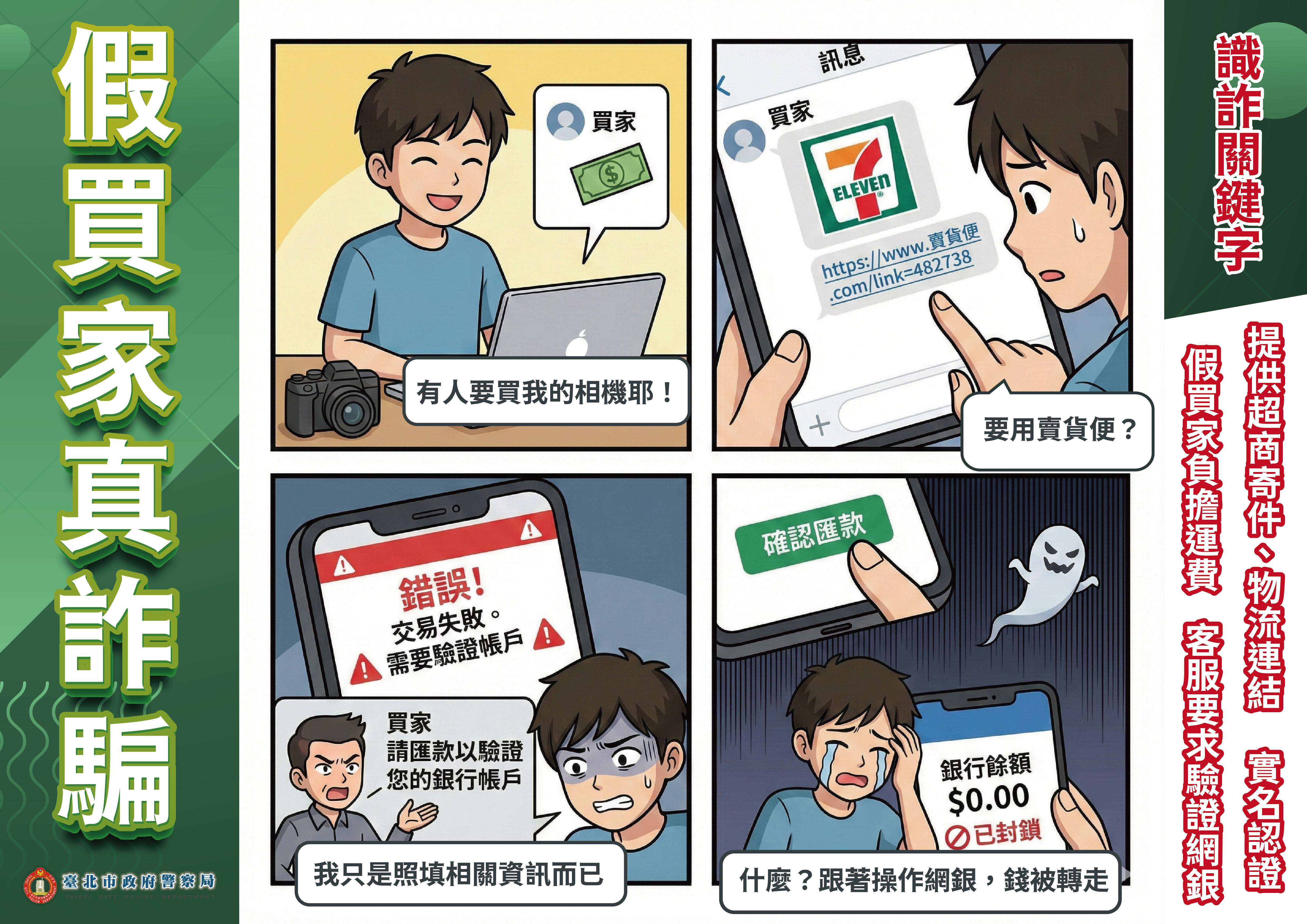 二、近期發現詐騙集團常用「假買家騙賣家」、「假中獎詐 騙」等方式,誘導民眾點擊釣魚連結,騙取個人資料及金融帳戶等資訊,進而綁定電子支付盜領財物或將其帳戶內款項轉出。為避免詐騙集團藉以行騙,爰彙整宣導圖文素材4張(含114年11月打詐儀錶板數據、4格漫畫案例、宣導傳單)、影片1部及跑馬燈文字稿1份(如附件),作為12 月宣導主軸,並上傳Google雲端連結供下載,以利各單位 妥適運用於網路資源(官方網站、社群媒體、地方社 群),並全面更新實體宣導(實體課程、智慧螢幕、電視牆、跑馬燈等)管道素材,提升識詐宣導廣度。