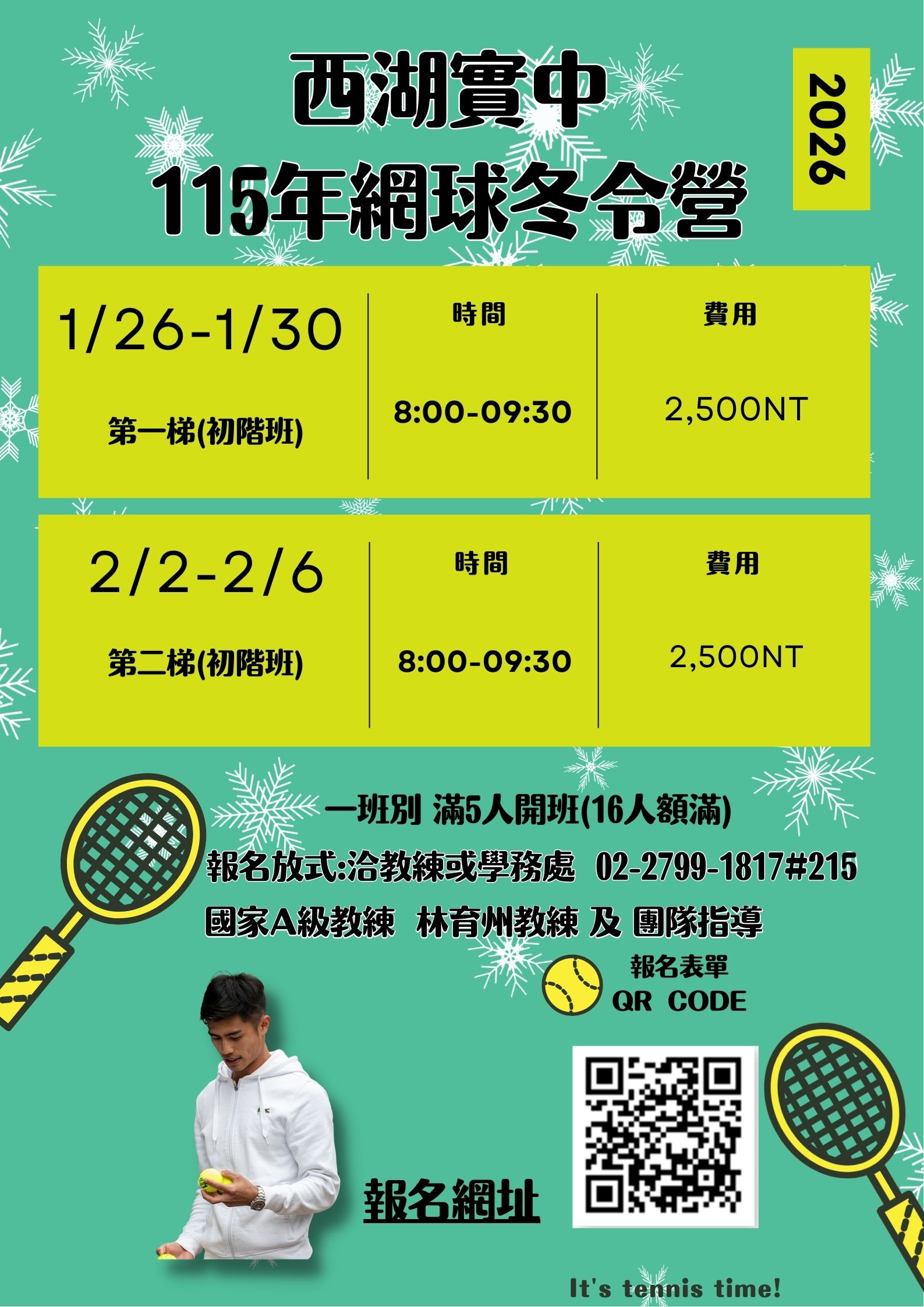 二、檢附本校115年度網球冬令營活動實施計畫暨報名表1份以及活動海報。