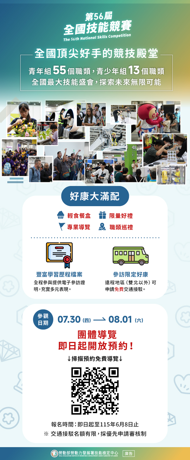 旨揭活動資訊請洽以下宣傳平台,歡迎轉發並鼓勵應用。 (一)活動官網:https://worldskillstw.wdasec.gov.tw/ (二)FaceBook:https://www.facebook.com/WDASEC (三)Instagram:https://www.instagram.com /worldskillstw/
