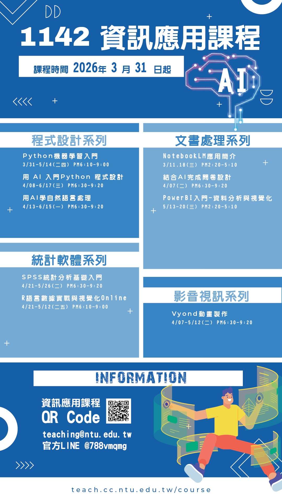 四、課程詳細資訊及報名方式,請逕至本校計算機及資訊網路中心網站查詢:https://teach.cc.ntu.edu.tw/course。
